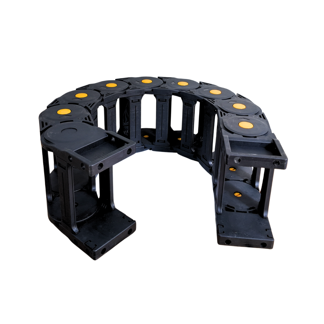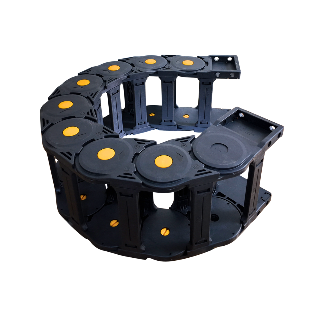 Cadena de arrastre para cable o tubo. Cada eslabón se puede desarmar para modificar la longitud según el requerimiento.