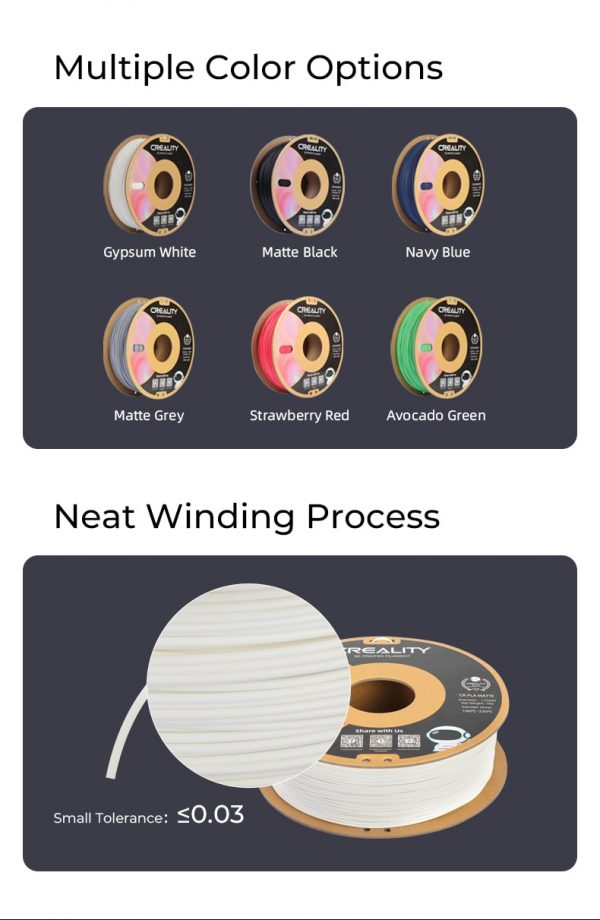 El CR-PLA Matte cuenta con un excelente acabado de superficie mate lo que le da un efecto de impresión mejor que el PLA normal. Esto al ocultar la laminación de la materia impresa. Es un material respetuoso con el medio ambiente, empaquetado en bolsas al vacío y cartón reciclado. Sin olor ni toxicidad en el proceso de impresión.