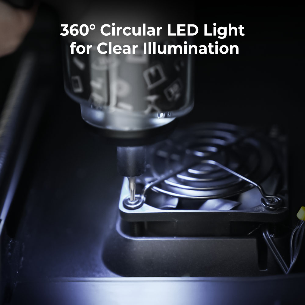 IluminaciĂłn LED Integrada: El cabezal cuenta con luces LED que eliminan las sombras en áreas oscuras del chasis. Puedes trabajar con total claridad incluso en los rincones más difĂciles de tu impresora 3D.