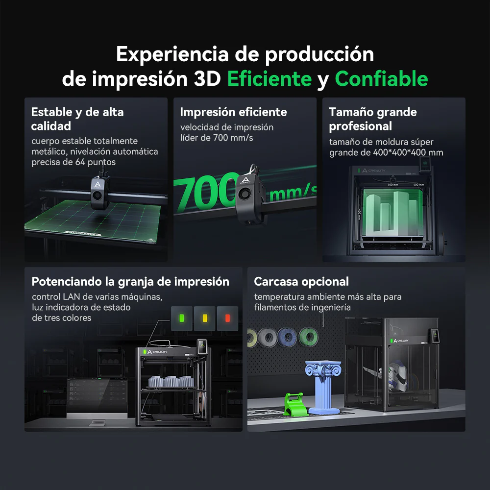 Gran volumen de impresión: Su espacio de construcción de 400 mm³ permite imprimir modelos de gran escala o múltiples piezas simultáneamente, ideal para diseñadores, ingenieros y fabricantes.