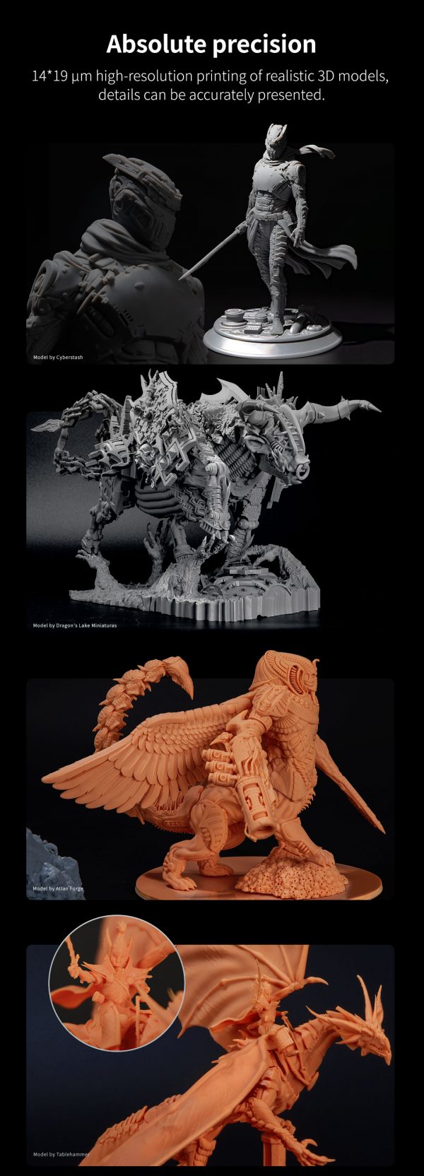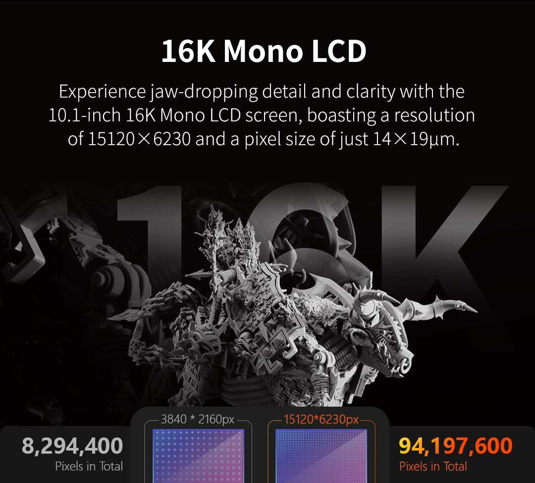 • Alta precisión: Gracias a su pantalla LCD monocromática de 16K (15120 × 6230 px), ofrece detalles nítidos y acabados profesionales.