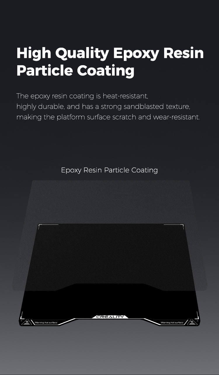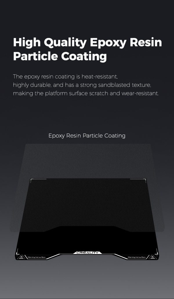 La mesa de resina epoxi Creality Hi es un accesorio de impresión 3D diseñado para un rendimiento superior. Por consiguiente, esta mesa ofrece una alta calidad con un revestimiento de partículas de resina epoxi. Esto garantiza una excelente adherencia y, además, un modelado más estable.