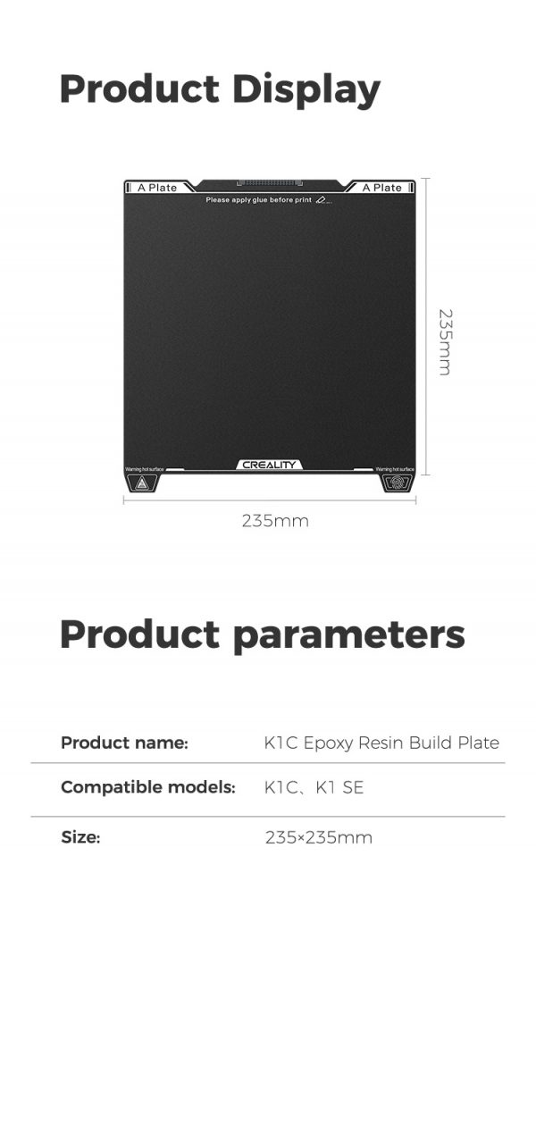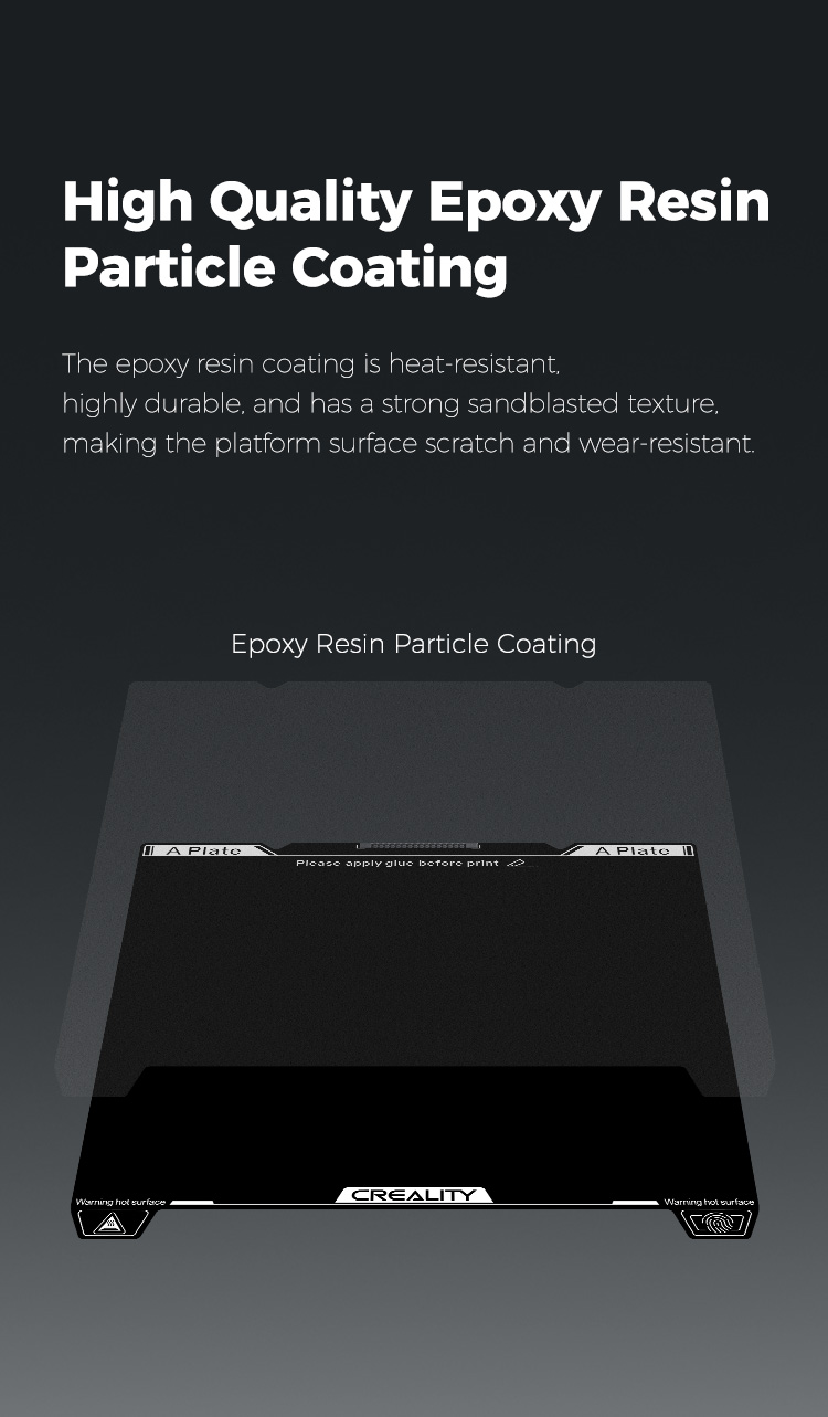 La mesa de resina epoxi Creality K1C es un accesorio de impresión 3D de alta calidad. Está diseñada para un rendimiento excepcional y duradero. Por consiguiente, esta mesa ofrece un revestimiento de partículas de resina epoxi. Este revestimiento asegura una ultra-alta adherencia. Como resultado, el modelado es más estable durante la impresión. La mesa es compatible con el modelo K1C. Además, su tamaño es de 255×255 mm.