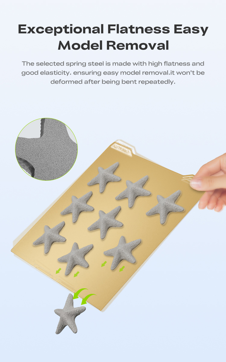 • Extracción Magnética y Flexible: Al finalizar la impresión, simplemente flexiona la lámina de acero para retirar tus piezas de forma instantánea.